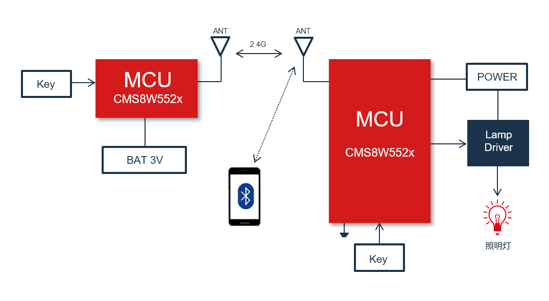 LED照明是指利用物联网技术、有线/无线通讯技术、计算机智能化信息处理及节能型电器控制等技术组成的分布式无线遥测、遥控、遥讯控制系统,具有灯光亮度的强弱调节、灯光软启动、定时控制、场景设置等功能,并达到预定灯光效果。拓能半导体基于超低功耗高性能8位RISC无线SoC - CMS8W552x解决方案,支持灯具亮度、色温控制功能。支持远程和本地局域网络控制。